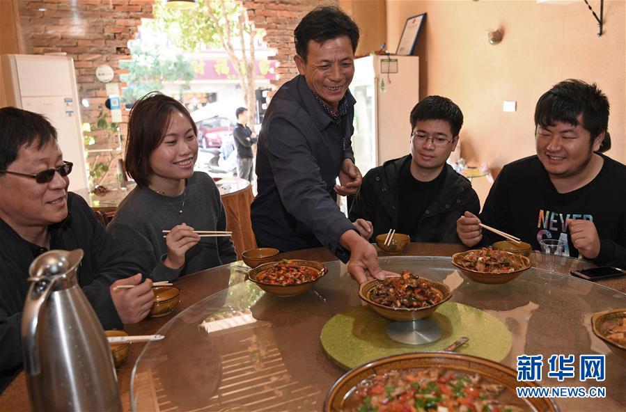 舒港發(fā)在自家的酒店里招待游客(10月28日攝)。