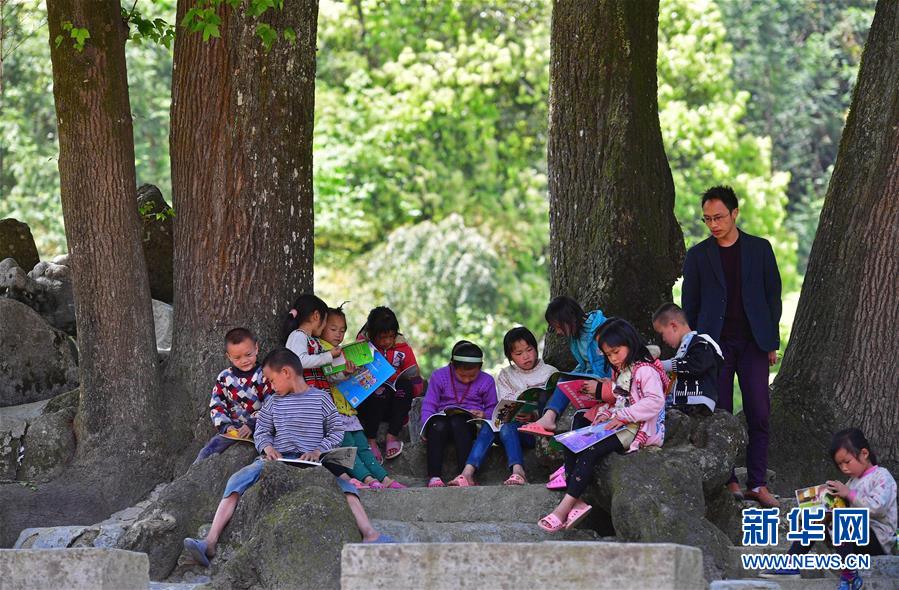 烏英教學點的孩子們在大樹下學習(4月17日攝)。
