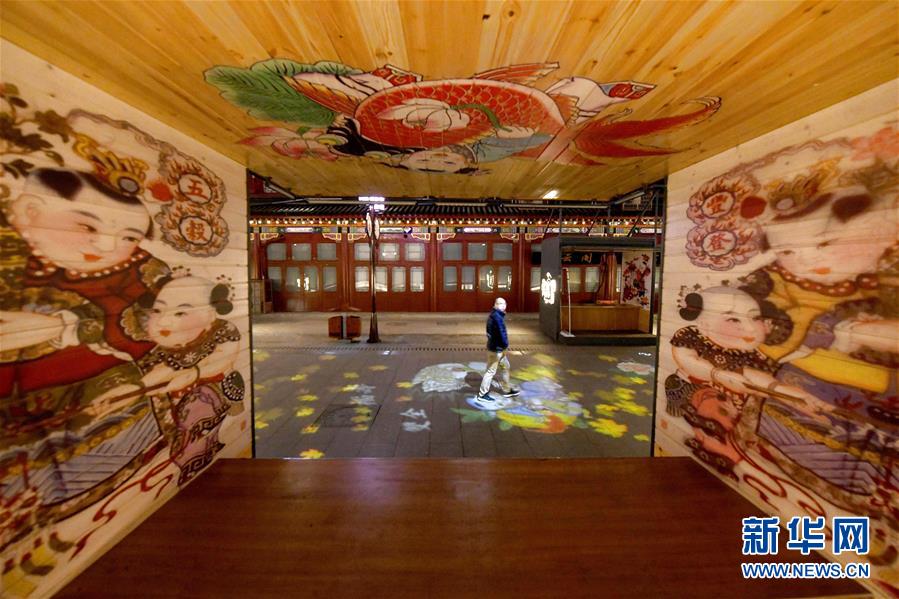12月4日,一名游客走在布滿楊柳青年畫主題燈光的步行街上。 近日,天津市西青區(qū)楊柳青古鎮(zhèn)在步行街新增9組以楊柳青年畫代表作為主題的動態(tài)夜景燈光,講述古鎮(zhèn)與年畫的歷史。 新華社記者 岳月偉 攝