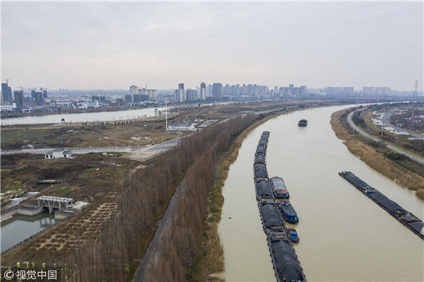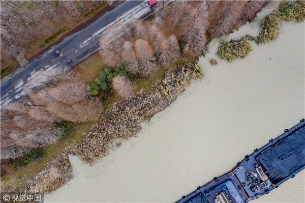 2018年12月27日,江蘇淮安,航拍京杭大運(yùn)河淮安段冬日景色。吳揚(yáng)/視覺中國