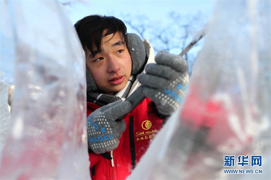 12月27日,選手們在比賽中完善冰雕作品。 當日,第十六屆黑龍江省大學生冰雕藝術設計創(chuàng)作大賽在哈爾濱兆麟公園落下帷幕,全省高校共有99支隊伍參賽。 新華社記者曹霽陽攝