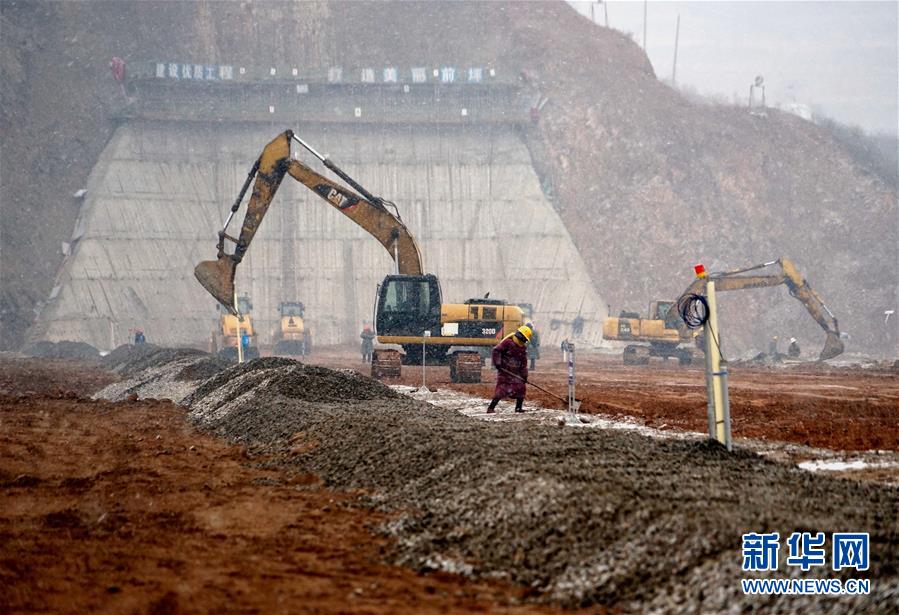 12月27日,工作人員和大型機(jī)械在前坪水庫大壩上施工。目前,被國務(wù)院列為172項(xiàng)節(jié)水供水重大水利工程之一的前坪水庫主體工程建設(shè)進(jìn)度已超八成。該水庫位于河南省汝陽縣前坪村,是一座以防洪為主,兼具供水、灌溉、發(fā)電功能的大型水利樞紐工程。新華社記者 李安 攝