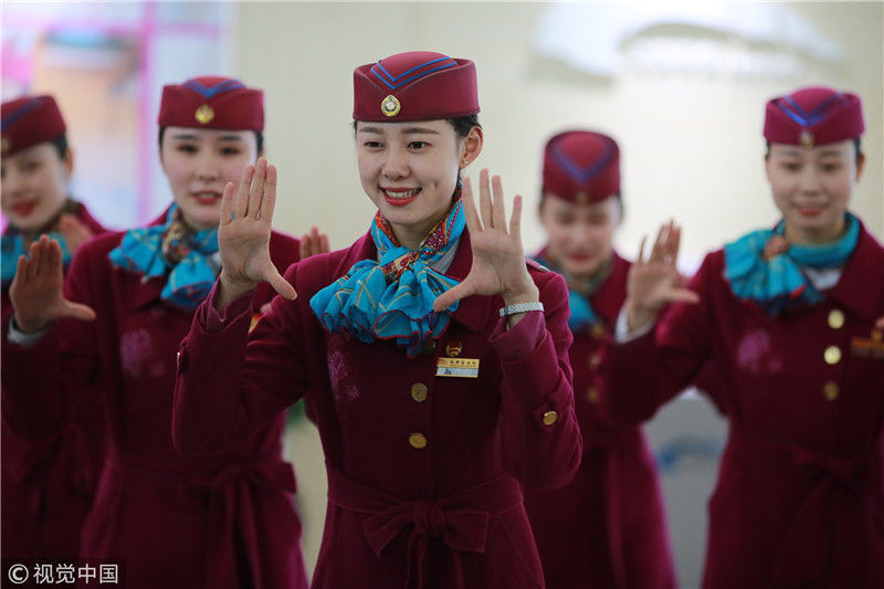 2018年12月27日,四川成都,為備戰(zhàn)即將開(kāi)通的成雅鐵路,中國(guó)鐵路成都局集團(tuán)有限公司成都客運(yùn)段動(dòng)車(chē)二隊(duì)對(duì)成雅動(dòng)車(chē)的乘務(wù)人員進(jìn)行理論、形體、服務(wù)禮儀等內(nèi)容的培訓(xùn)。