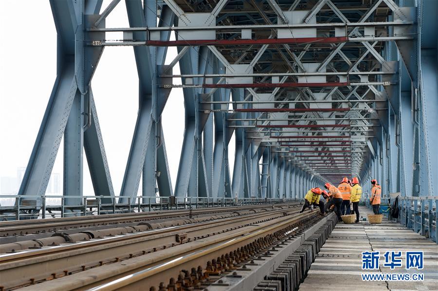 線路工們在南京長江大橋鐵路橋進(jìn)行木枕改道作業(yè)(12月27日攝)。
