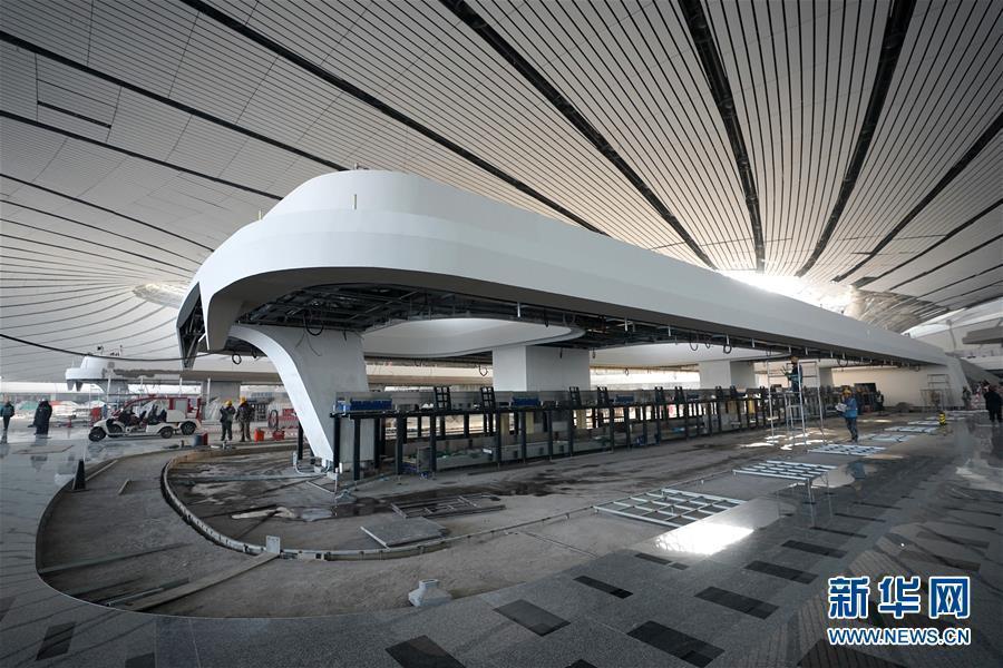 在北京大興國際機場主航站樓內(nèi),施工人員在進行裝飾裝修工作。新華社記者 鞠煥宗 攝 圖片來源:新華網(wǎng)