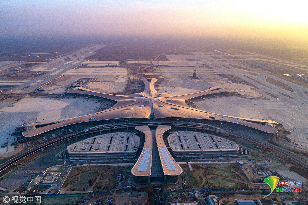 中國(guó)青年網(wǎng)北京12月20日電 2018年12月19日,北京大興國(guó)際機(jī)場(chǎng)航站樓的屋面已基本完工,一只金色“鳳凰”完整地出現(xiàn)在北京城南。航站樓的室內(nèi)裝修在有條不紊的推進(jìn)中。