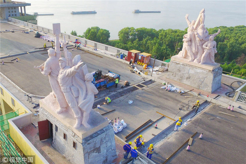 2018年6月24日,南京長(zhǎng)江大橋修葺一新的淡粉色的工農(nóng)兵雕像。