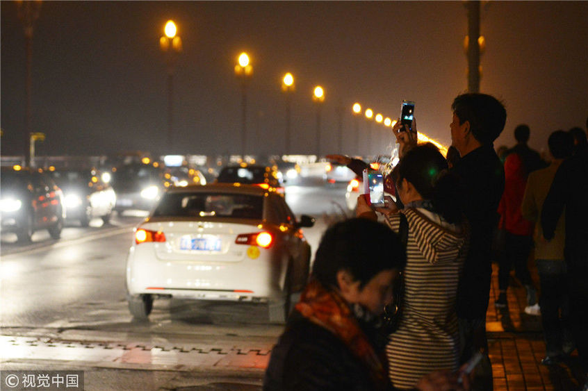 維修改造后的南京長(zhǎng)江大橋全線恢復(fù)通車。市民在觀看南京長(zhǎng)江大橋通車。