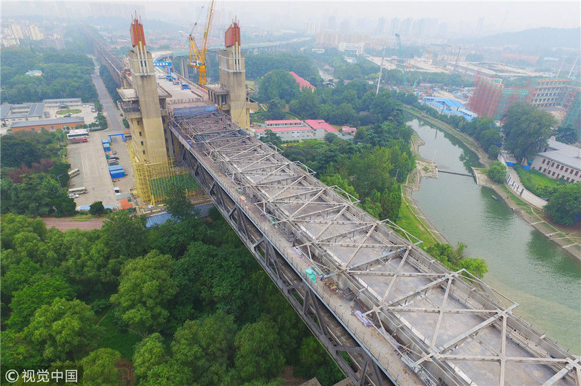 2017年9月19日,南京長(zhǎng)江大橋正橋的混凝土面板已經(jīng)全部拆除,僅剩交錯(cuò)縱橫的鋼桁架橫跨在長(zhǎng)江之上,從高空俯瞰猶如一條“鋼鐵巨龍”。