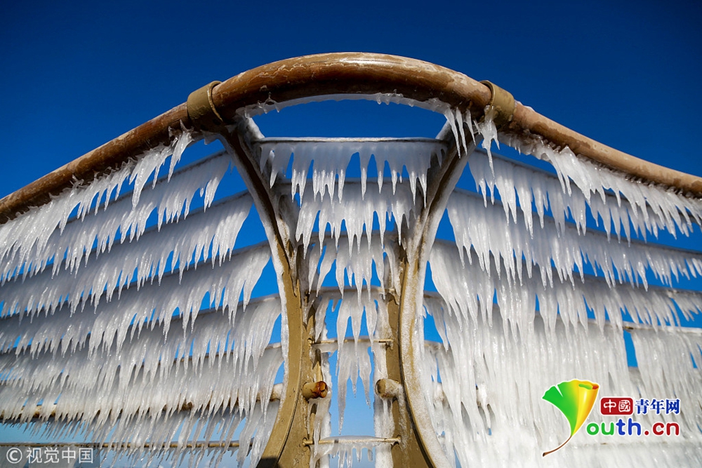 2018年12月29日,大連市迎來入冬以來最冷-12℃的低溫,在大風(fēng)和潮汐的作用下,海水在岸邊的護(hù)欄上瞬間凝固,凝結(jié)并形成大面積形狀各異的冰凌,在延綿5公里的木棧道上形成奇特的冰凌奇觀。