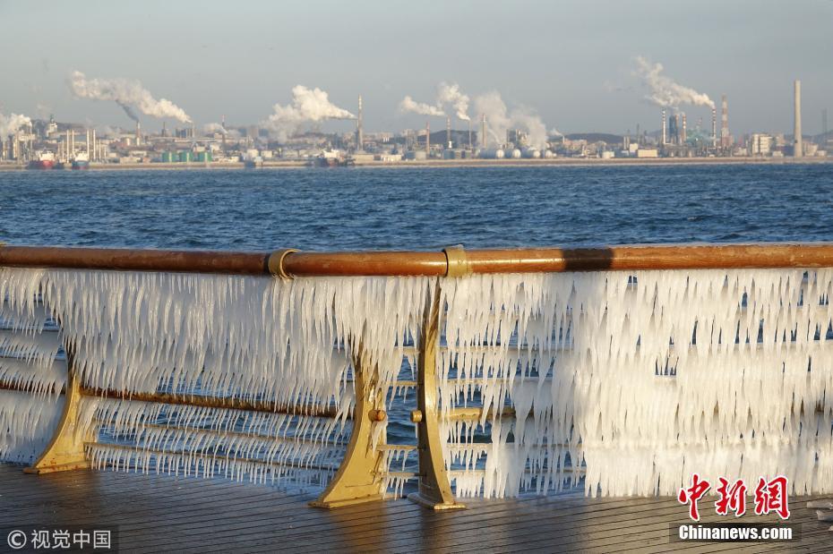 渤海大連北部海域潮水涌上岸邊,在堤壩的護欄上凝結成千姿百態(tài)的冰凌奇觀。