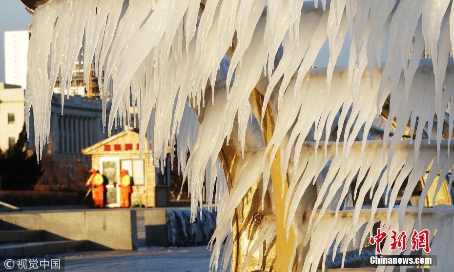 2018年12月29日,大連,晶瑩剔透的冰凌錯落有致的懸掛在東港海岸的木棧道護欄上,美輪美奐,形成了一道“風雕冰琢”的風景。