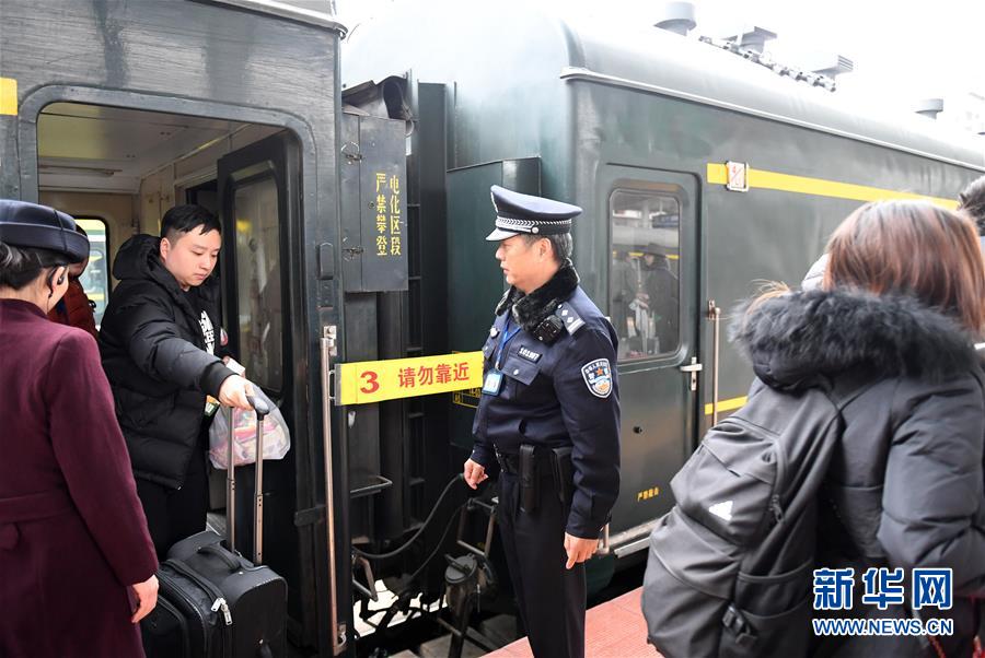 在廣西憑祥火車站,鐵路公安民警陸日峰在一列準備開往越南的火車旁值勤(2018年12月31日攝)。 新華社記者陸波岸攝