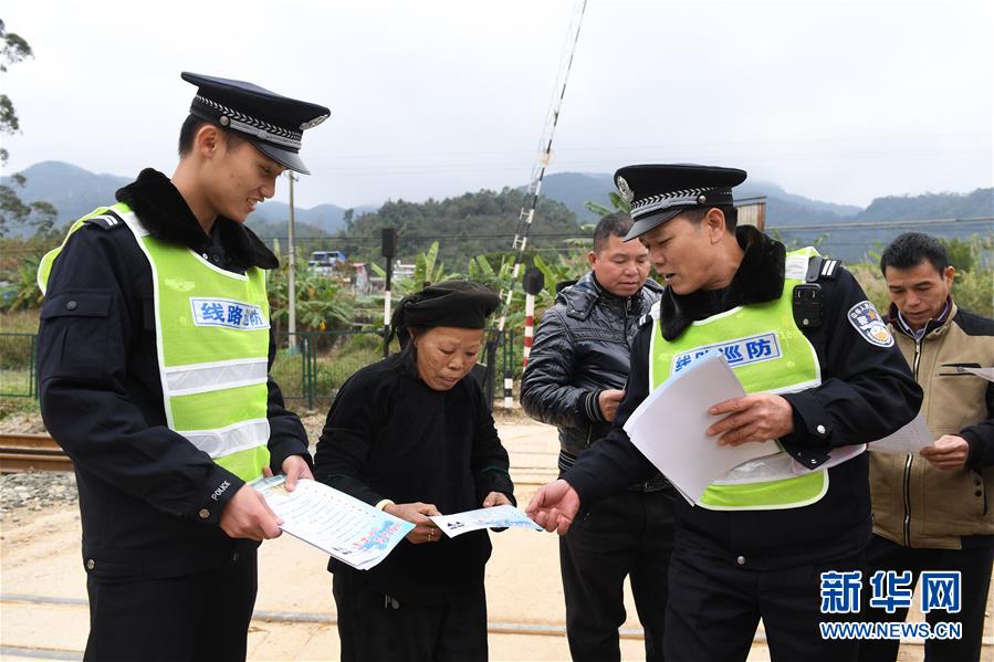鐵路公安民警陸日峰(前排右一)和同事在中越邊境巡線時(shí)給鐵路沿線的群眾發(fā)放安全宣傳單(2018年12月31日攝)。 新華社記者陸波岸攝