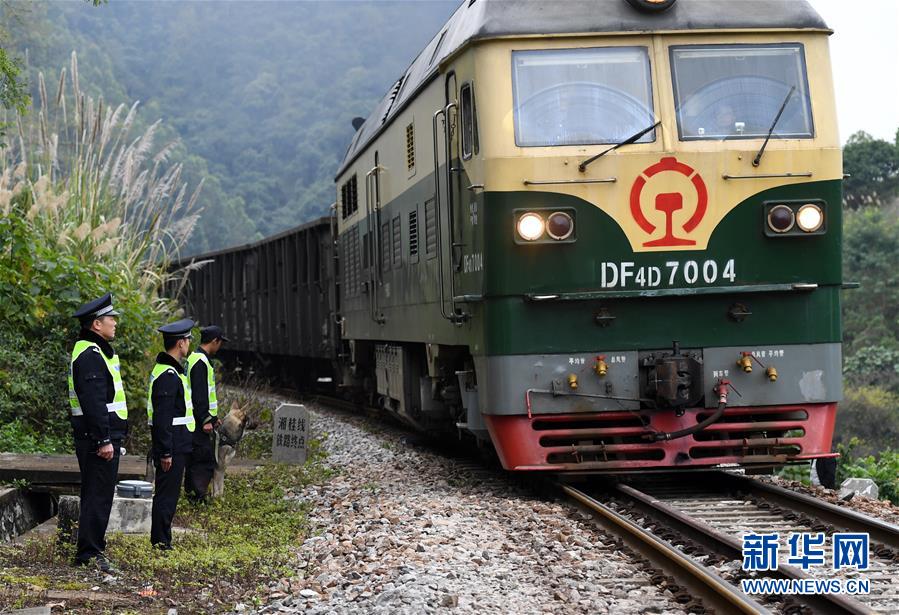 鐵路公安民警陸日峰(左一)和同事目送著一列火車通過(guò)湘桂線鐵路終點(diǎn)從越南進(jìn)入中國(guó)(2018年12月31日攝)。新華社記者陸波岸攝