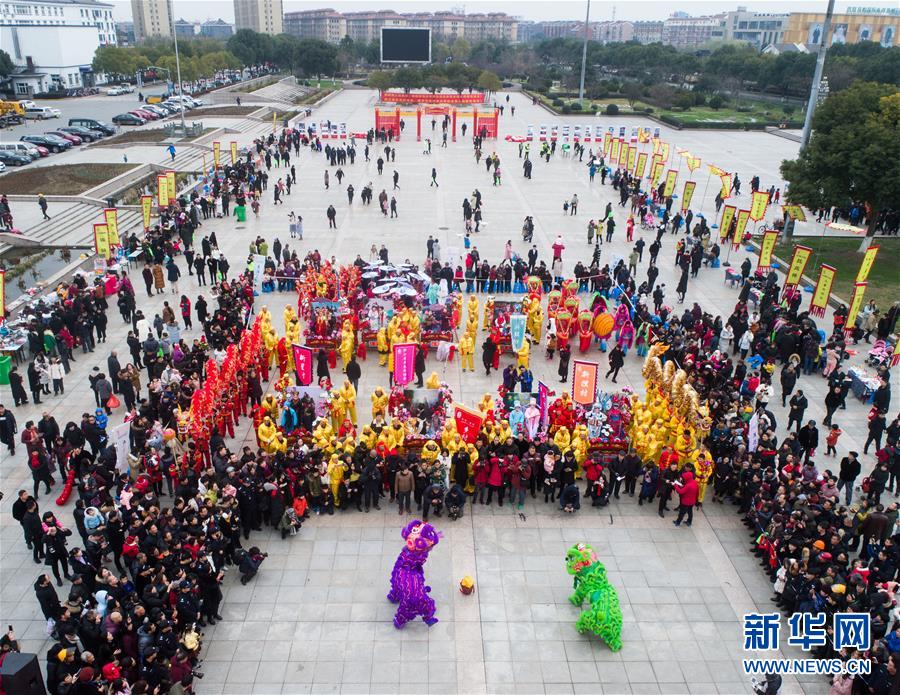 1月1日,演員在展演活動上進行舞龍舞獅等非遺傳統(tǒng)文化表演(無人機拍攝)。2019年元旦,浙江省桐鄉(xiāng)市濮院鎮(zhèn)舉辦新年“非遺文化藝術(shù)節(jié)”活動,濮院鎮(zhèn)下屬多個鄉(xiāng)村的傳統(tǒng)美食制作、手工藝品、非遺文化表演等鄉(xiāng)村特色非遺項目在濮院鎮(zhèn)中心廣場進行集中展示展演。新華社記者 徐昱 攝