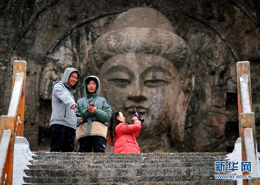 1月9日,游客在雪中游覽洛陽(yáng)龍門石窟景區(qū)。 新華社記者李安攝