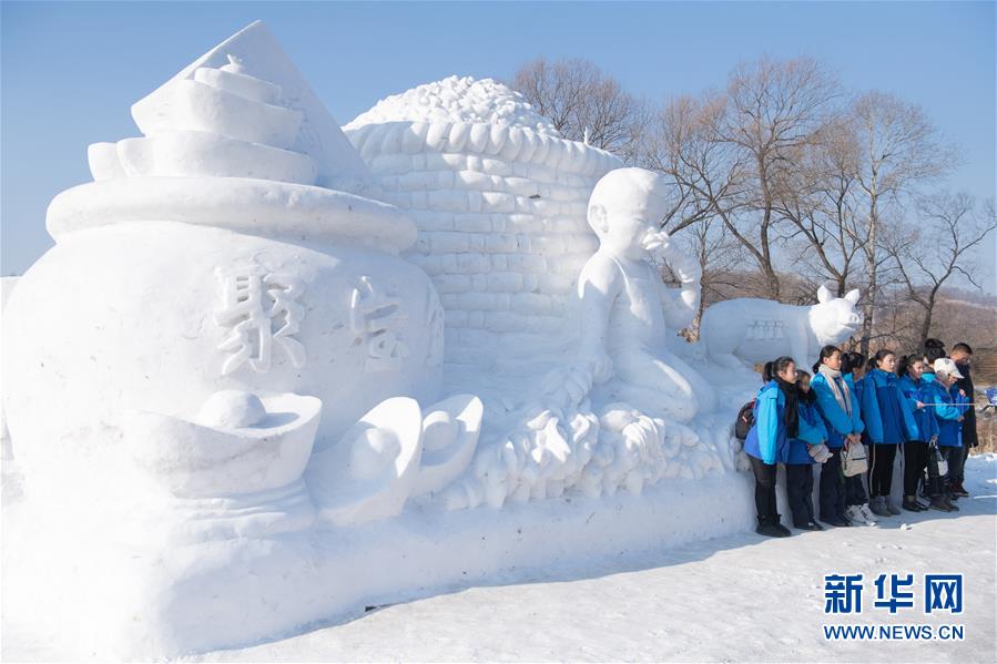 1月10日,在舒蘭市二合屯,游客在雪雕前合影留念。 新華社記者張楠攝
