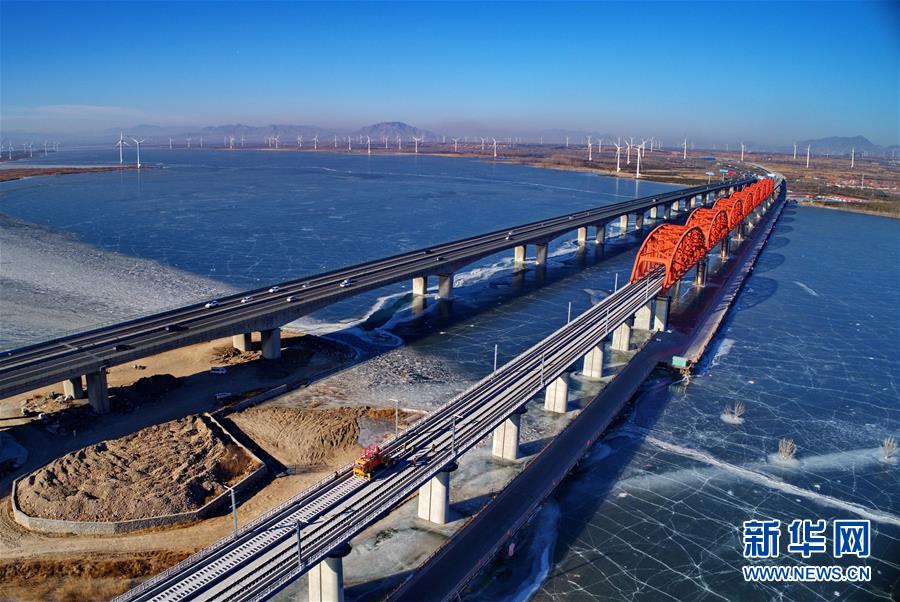 1月13日,中鐵三局的工人在京張高鐵官廳水庫特大橋進行鋪軌作業(yè)(無人機拍攝)。 新華社記者 楊世堯 攝