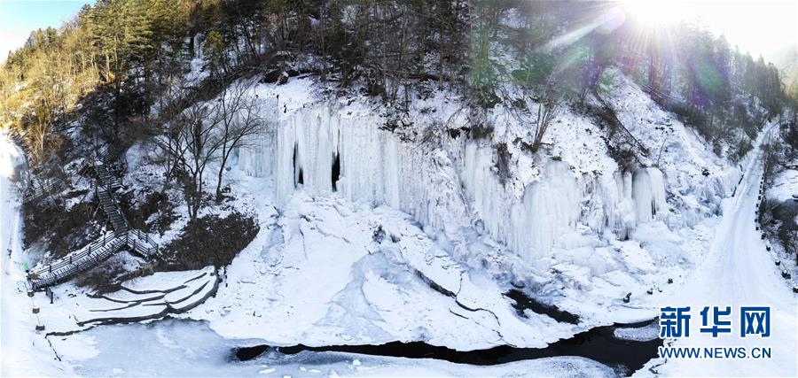 這是在吉林省長白縣十五道溝望天鵝景區(qū)內(nèi)拍攝的冰瀑景觀(拼接照片,1月3日無人機(jī)拍攝)。
