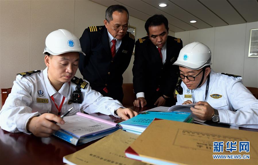 1月15日,??诤J戮止ぷ魅藛T在粵海鐵4號客滾船上檢查文書文件。 新華社記者 楊冠宇 攝