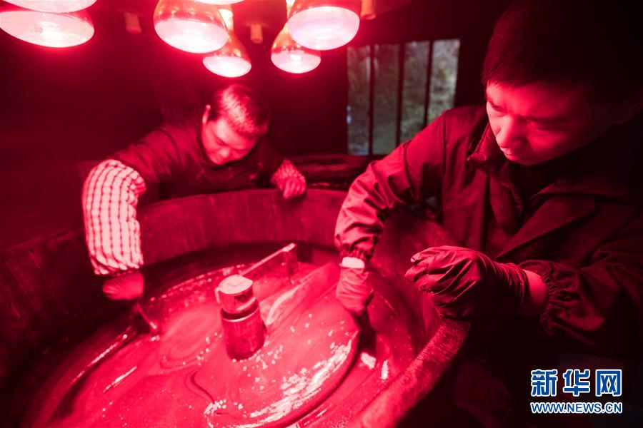 1月15日,吳榮強(qiáng)(右)和徒弟在龍泉市牛頭嶺村“七分醉”工作室曬漆。 新華社記者翁忻旸攝