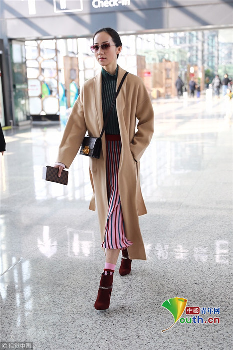 2019年1月17日,上海,韓雪現(xiàn)身機(jī)場,穿著條紋紗裙露出小腿,十分抗凍,她搭配經(jīng)典的駝色大衣,氣質(zhì)出眾在機(jī)場人群中相當(dāng)搶鏡。