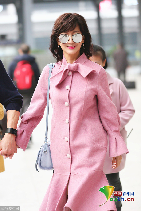 趙雅芝著粉嫩魚(yú)尾大衣優(yōu)雅甜美 獲老公一路牽手