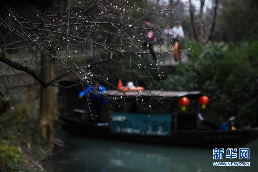 2月17日,游客在杭州西溪濕地國(guó)家公園乘船賞梅。