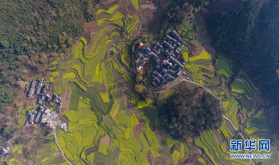 3月20日在貴州錦屏縣敦寨鎮(zhèn)拍攝的春景(無人機拍攝)。春分將至,貴州各地成片的油菜花漸次綻放,如同金色的地毯鋪上云貴高原。 新華社記者 歐東衢 攝