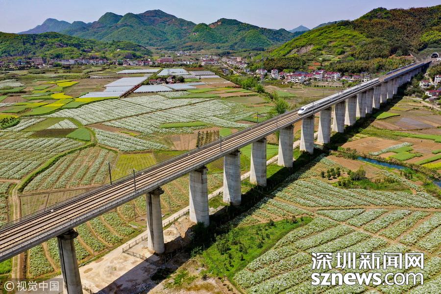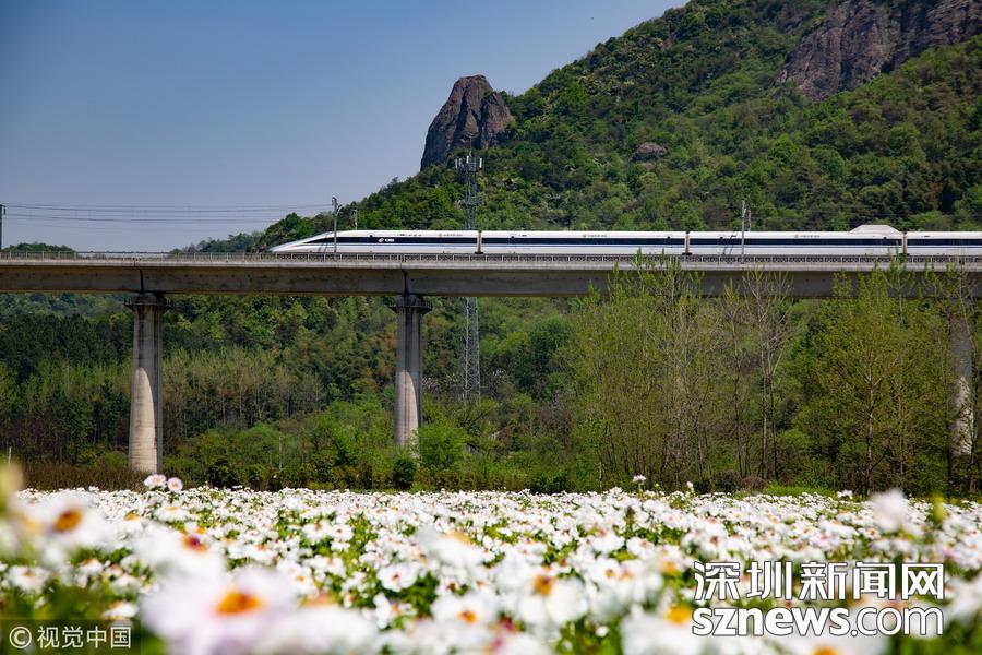 2019年4月8日,一列高鐵列車(chē)從京福高鐵安徽銅陵段一片盛開(kāi)的鳳丹花海中駛過(guò)。隨著氣溫回升,安徽省銅陵市境內(nèi)的鳳丹競(jìng)相綻放,高鐵列車(chē)穿行其間,成為春日里一道美麗的風(fēng)景線(xiàn)。