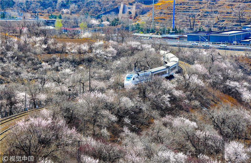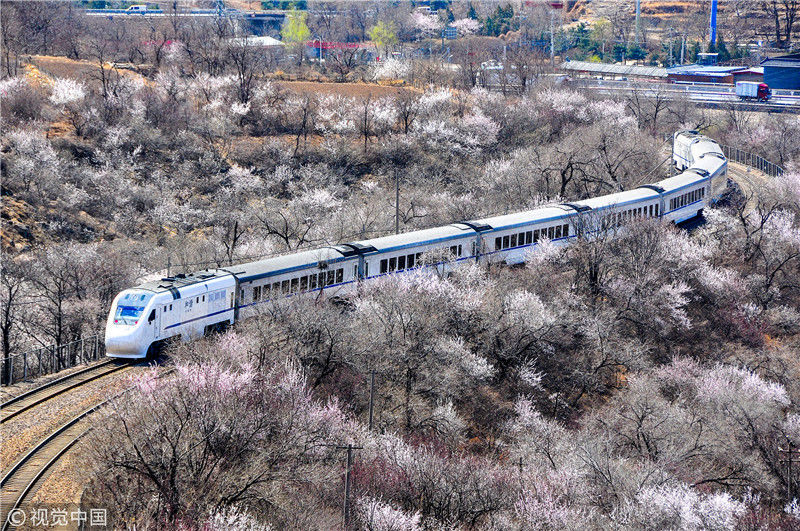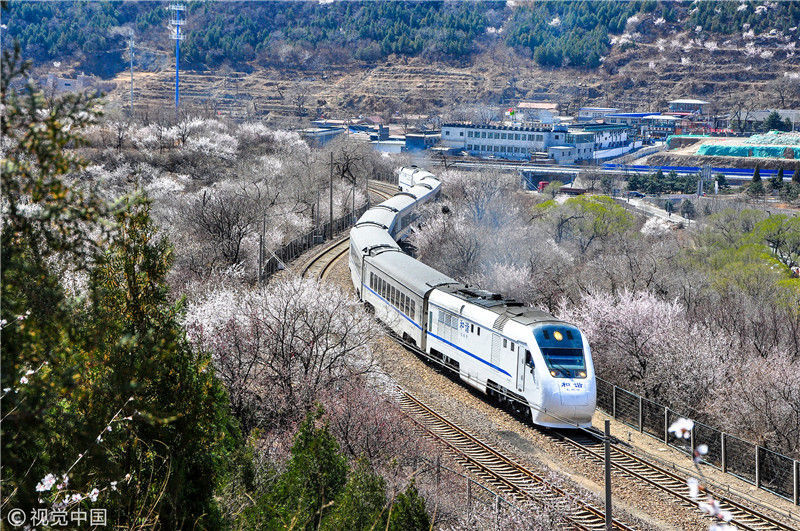 2019年3月22日,北京居庸關(guān)附近的山花盛開(kāi),S2線(xiàn)列車(chē)穿行在花海之中,構(gòu)成一幅美麗的畫(huà)面。