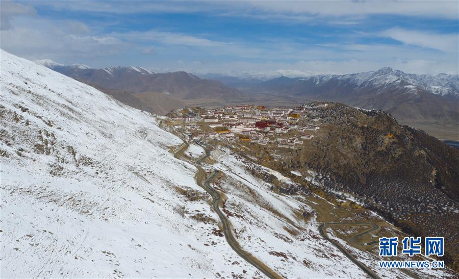 雪后的甘丹寺(4月8日無人機拍攝)。  新華社記者普布扎西攝
