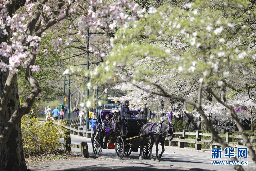 4月16日,人們?cè)诿绹~約中央公園乘坐馬車游玩。 新華社記者 王迎 攝