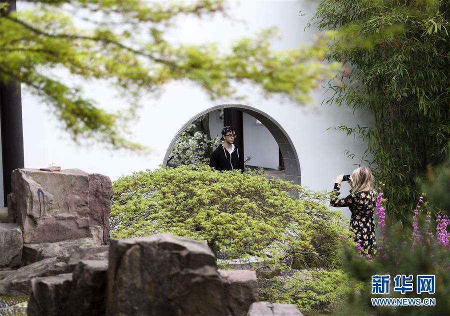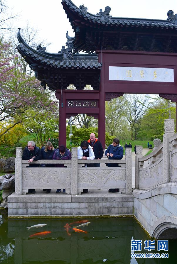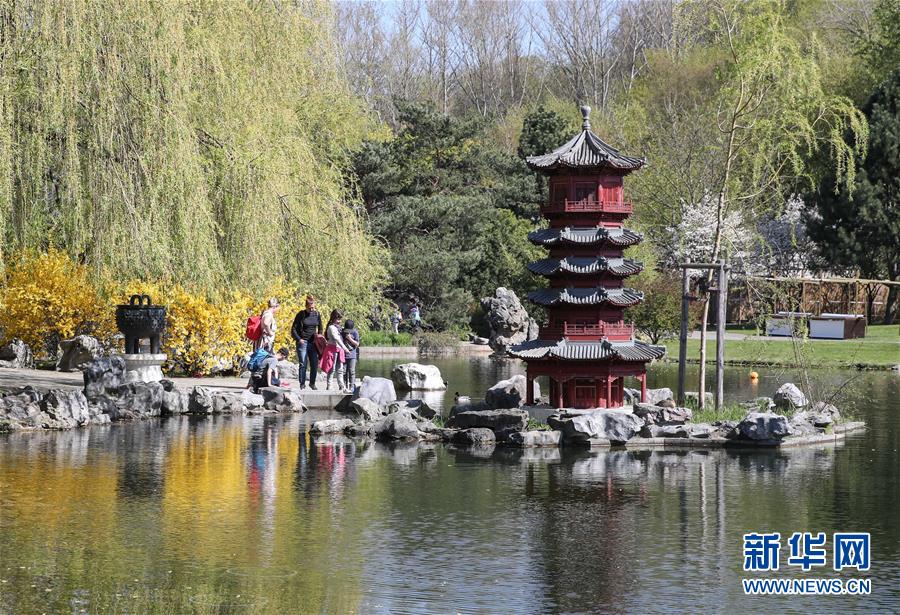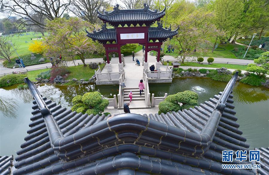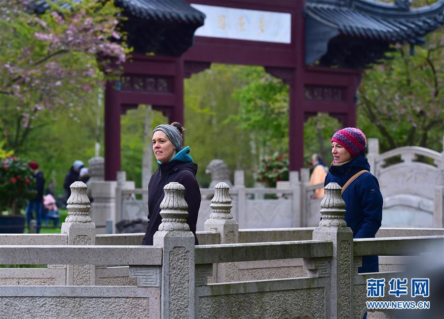 2019年4月13日,在德國(guó)曼海姆,游客在中式園林“多景園”內(nèi)游玩。“多景園”位于曼海姆市路易森公園內(nèi),占地約6000平方米,建筑面積約1500平方米,是目前歐洲最為完整的中國(guó)古典園林建筑群落之一。 新華社記者逯陽(yáng)攝