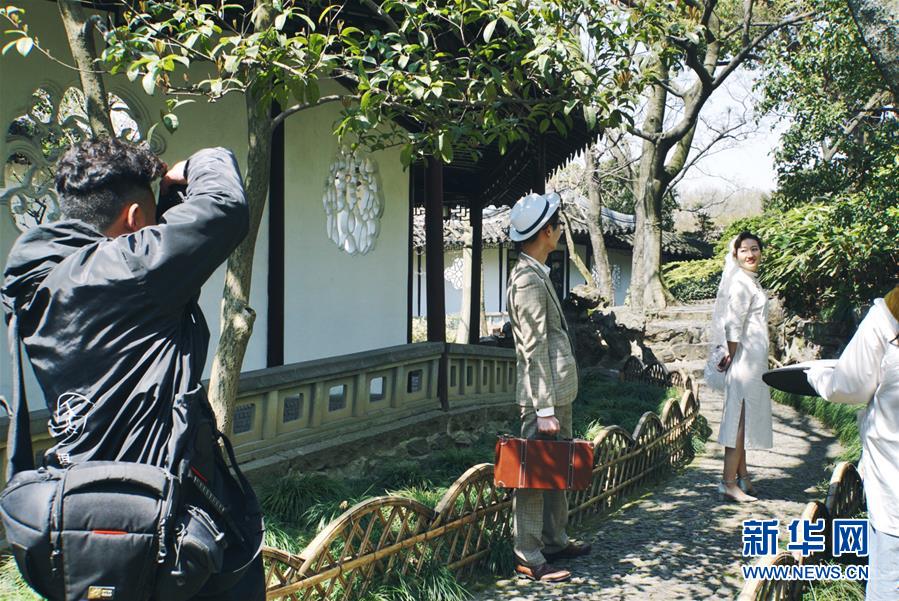 2019年4月1日,一對(duì)夫妻在中國(guó)蘇州滄浪亭內(nèi)拍婚紗照。2000年,滄浪亭和藝圃、耦園、獅子林、退思園作為蘇州古典園林的擴(kuò)展項(xiàng)目被列入聯(lián)合國(guó)教科文組織世界文化遺產(chǎn)名單。 新華社記者杜涓涓攝