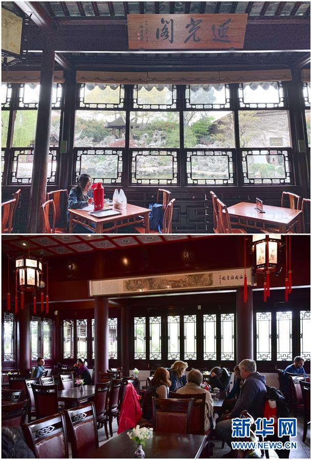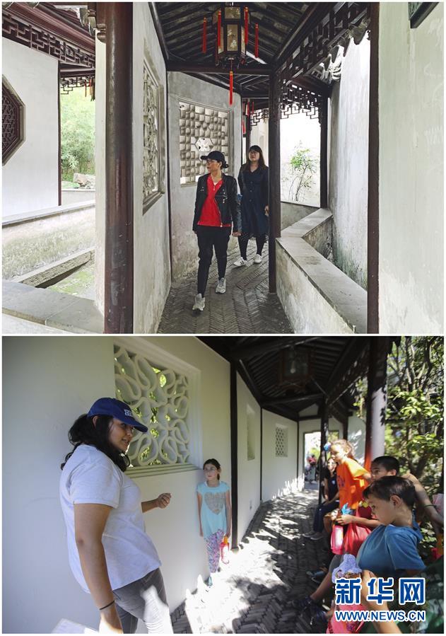 這張拼版照片展示的是:上圖,2019年4月2日,游客在中國(guó)蘇州留園內(nèi)游覽(新華社記者杜涓涓攝);下圖,2017年9月23日,在美國(guó)紐約寄興園舉行的迎中秋活動(dòng)上,孩子們?cè)谥驹刚叩膸ьI(lǐng)下參觀(新華社記者王迎攝)。