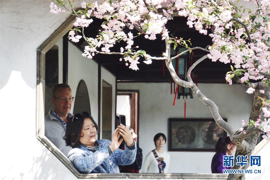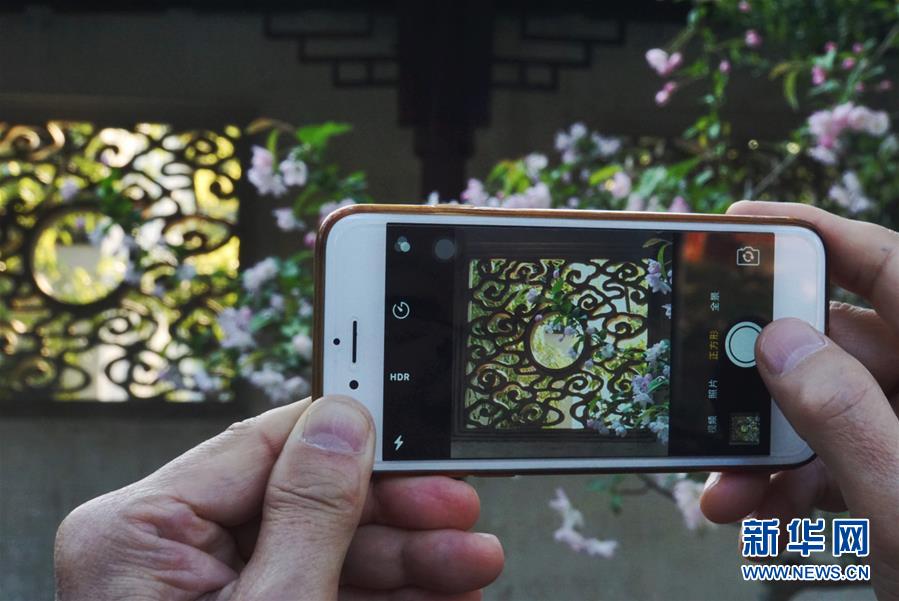 2019年4月1日,游客在中國(guó)蘇州網(wǎng)師園內(nèi)自拍。1997年,網(wǎng)師園和拙政園、留園、環(huán)秀山莊被列入聯(lián)合國(guó)教科文組織世界文化遺產(chǎn)名單。 新華社記者杜涓涓攝