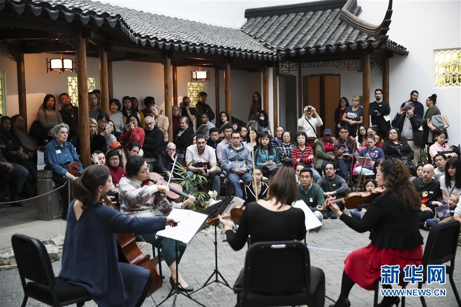 2018年2月24日,人們?cè)诿绹?guó)紐約大都會(huì)博物館“明軒”欣賞演出,慶祝新春佳節(jié)。中式庭院“明軒”是中國(guó)第一個(gè)落戶海外的蘇式園林,位于美國(guó)紐約大都會(huì)博物館二層的玻璃天棚下,是模仿中國(guó)蘇州網(wǎng)師園中的“殿春簃”設(shè)計(jì)建造而成的。“明軒”由蘇州市園林管理局承建,所用的磚、瓦、木材、構(gòu)件等在中國(guó)備好后,由20余名中國(guó)工程師和工匠在美國(guó)組裝。 新華社記者王迎攝