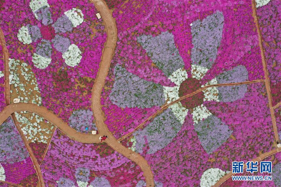 4月24日無(wú)人機(jī)拍攝的雨花谷景區(qū)。近日,河北省遷西縣雨花谷景區(qū)的芝櫻花盛開,吸引游客前來(lái)觀賞。 新華社記者 楊世堯 攝