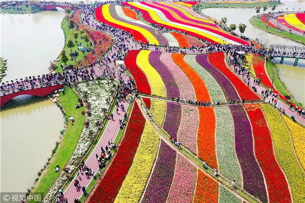 2019年4月6日,江蘇鹽城市大豐荷蘭花海的300萬株郁金香隨風(fēng)盛開,吸引了眾多市民和游客前來觀賞。從空中看,一片片彩色的郁金香花田仿佛巨幅彩帶,將數(shù)百畝花海裝扮得分外美麗。楊素平/視覺中國(guó)