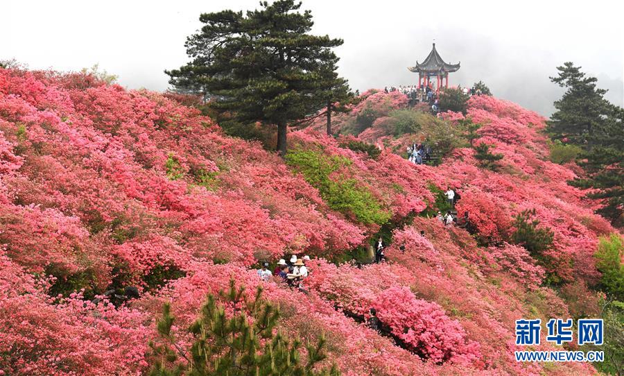 4月25日,游客在龜峰山杜鵑花海中游玩。 近日,湖北省麻城市龜峰山的10萬畝古杜鵑盛開,大量游客前來賞花觀景。 新華社記者 程敏 攝