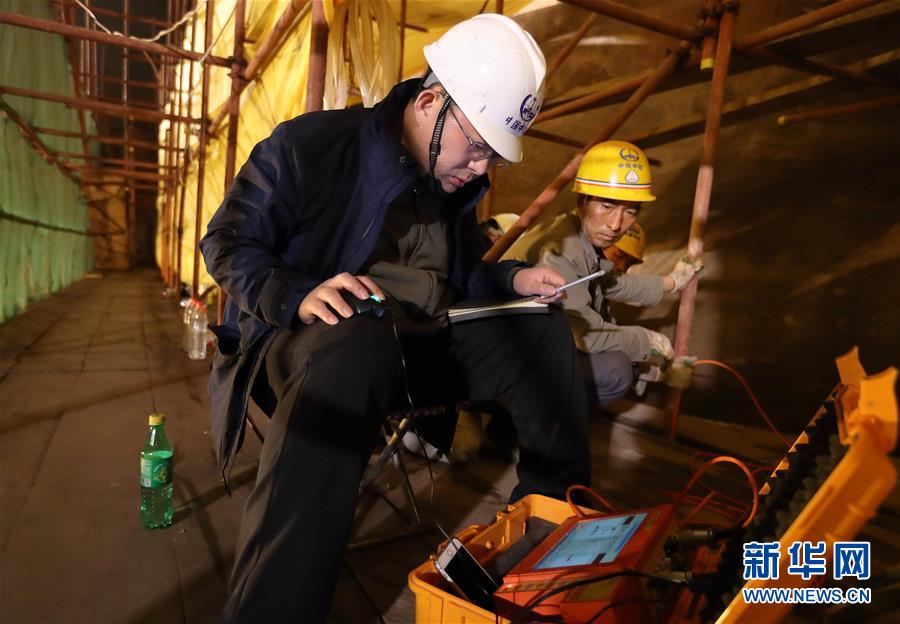 中鐵西北科學研究院有限公司文保中心的工程師孫博(左)在檢測探頭的數(shù)據(jù)穩(wěn)定性(3月18日攝)。新華社記者 江宏景 攝