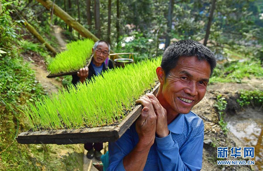 在黔桂烏英苗寨,村民搬運(yùn)秧苗去插秧(4月17日攝)。 新華社記者 黃孝邦 攝