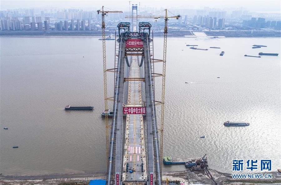 12月29日,武漢楊泗港長江大橋順利合龍(無人機拍攝)。新華社記者 肖藝九 攝