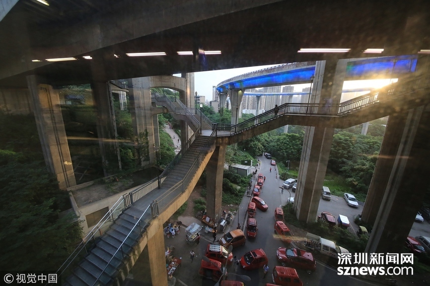 2018年5月29日,重慶,魔幻重慶又雙叒叕放大招!還有一個獨特的亮點,重慶軌道交通3號線銅元局站,出口由一段長梯銜接上方立交橋和下方的路面,與全國最高城市立交橋蘇家壩立交組成了獨特風景,許多游客專門趕來拍照。