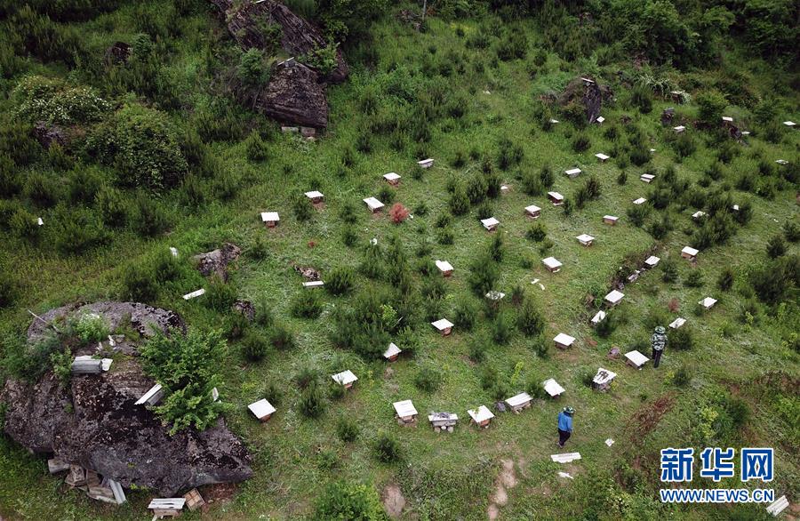 5月10日,在甘肅省隴南市徽縣大河店鎮(zhèn)硬灣村,蜂農(nóng)查看蜂箱情況(無(wú)人機(jī)拍攝)。 甘肅省隴南市徽縣大河店鎮(zhèn)硬灣村位于秦巴山區(qū)深處,2017年,在當(dāng)?shù)卣姆龀窒拢堁吕铣裁垧B(yǎng)殖農(nóng)民專業(yè)合作社成立,蜂農(nóng)們將傳統(tǒng)養(yǎng)蜂技藝和現(xiàn)代加工方式相結(jié)合,并通過(guò)電商等渠道打開(kāi)銷路,有效帶動(dòng)了當(dāng)?shù)刎毨Т迕衩撠氈赂?。目前整個(gè)合作社共有蜂箱2000余個(gè),每箱每年可帶來(lái)三四千元的收入。 新華社記者 馬寧 攝