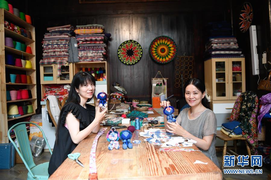 5月26日,在石舍村共同經(jīng)營(yíng)“三只蝸?!笔止に嚻飞痰旰涂蜅5慕忝藐愖袭嫞ㄓ遥?、陳莫寒在展示制作的手工藝品。 石舍村是浙江省桐廬縣富春江鄉(xiāng)村慢生活體驗(yàn)區(qū)中的三個(gè)村落之一,位置偏僻,依溪而居,風(fēng)景秀美。近年來(lái),石舍村結(jié)合古建筑保護(hù)工作,在清潔、美化村莊的基礎(chǔ)上,對(duì)一些廢棄古建筑進(jìn)行修繕,引入咖啡館、民宿等文化創(chuàng)意類項(xiàng)目,優(yōu)良的生態(tài)環(huán)境和濃郁的文化氛圍吸引大批游客前來(lái)體驗(yàn),小山村走上了一條發(fā)展美麗經(jīng)濟(jì)之路。2018年,石舍村接待游客10萬(wàn)8千余人次,旅游經(jīng)營(yíng)凈收入1260余萬(wàn)元。 新華社記者 黃宗治 攝