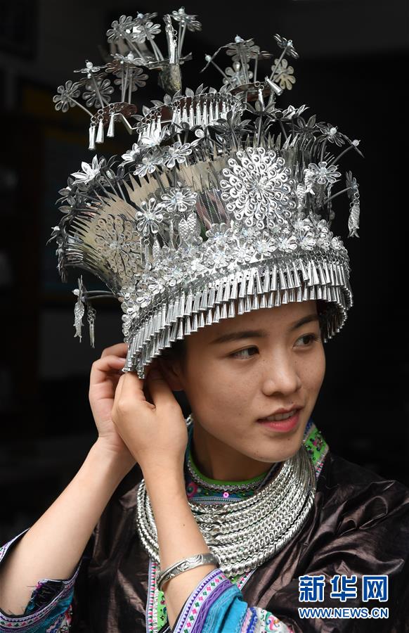 5月29日,在廣西融水苗族自治縣融水鎮(zhèn),一名女青年在戴苗族銀飾。