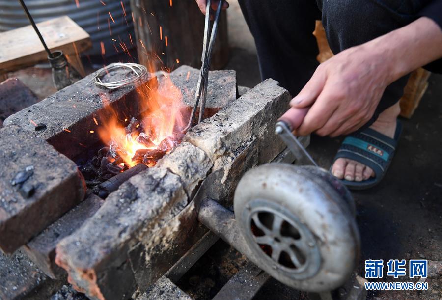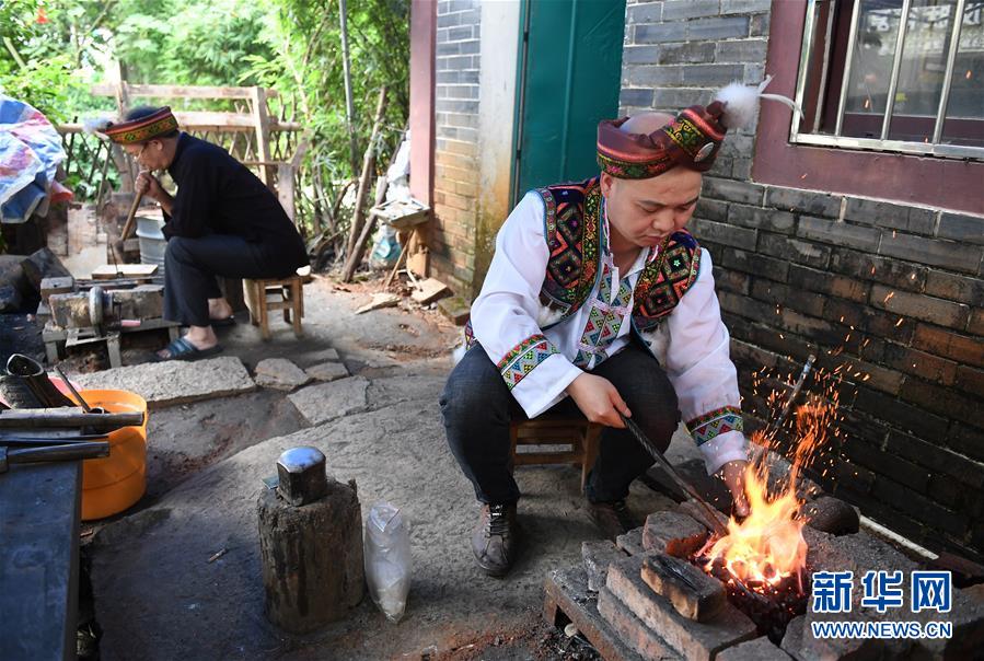 5月29日,在廣西融水苗族自治縣融水鎮(zhèn),銀匠陳四先鼓風(fēng)吹旺炭火準(zhǔn)備打造銀飾。